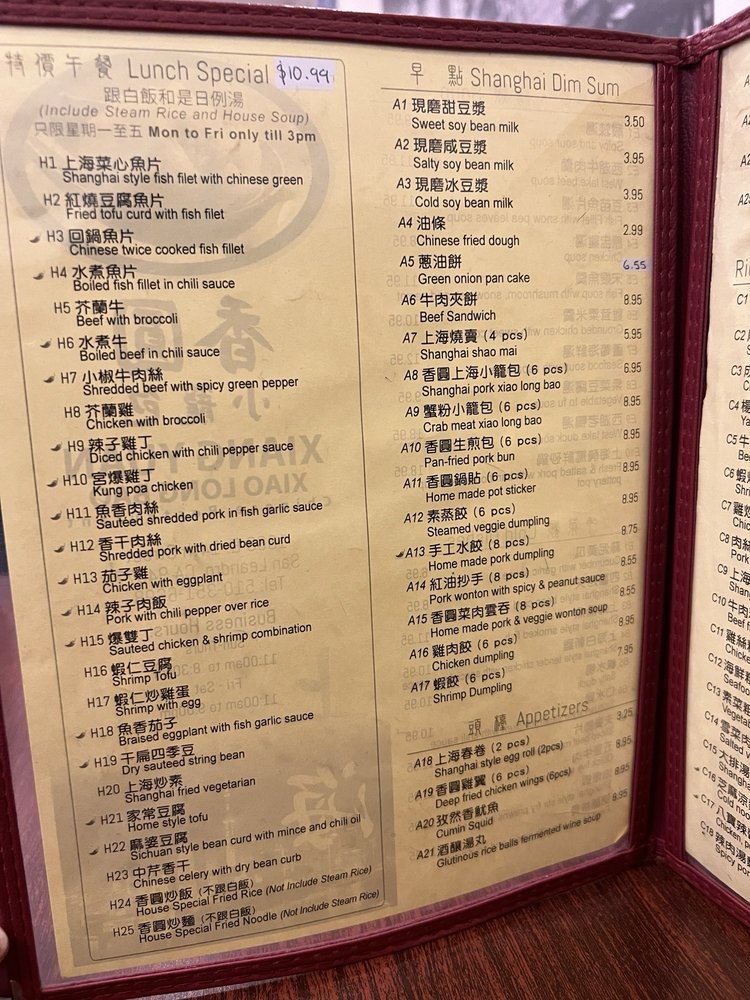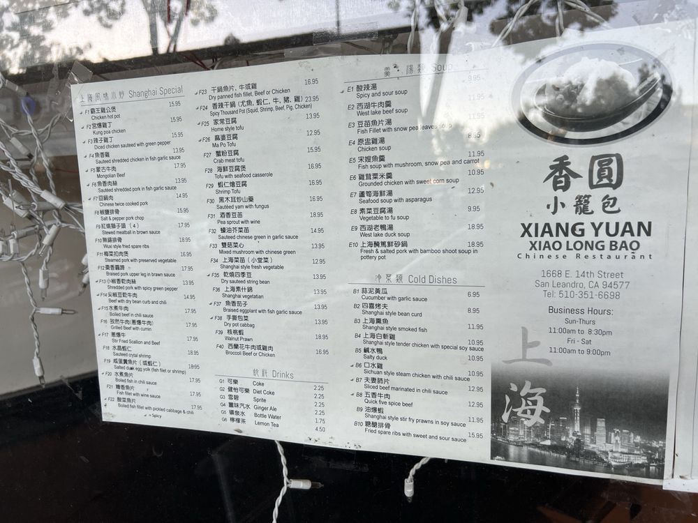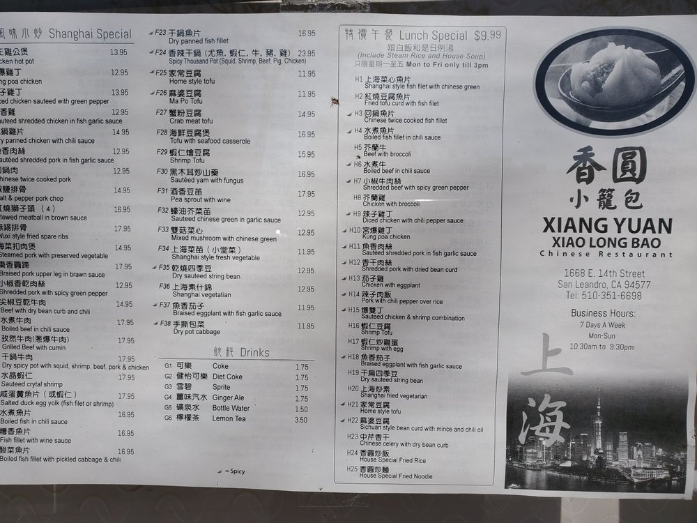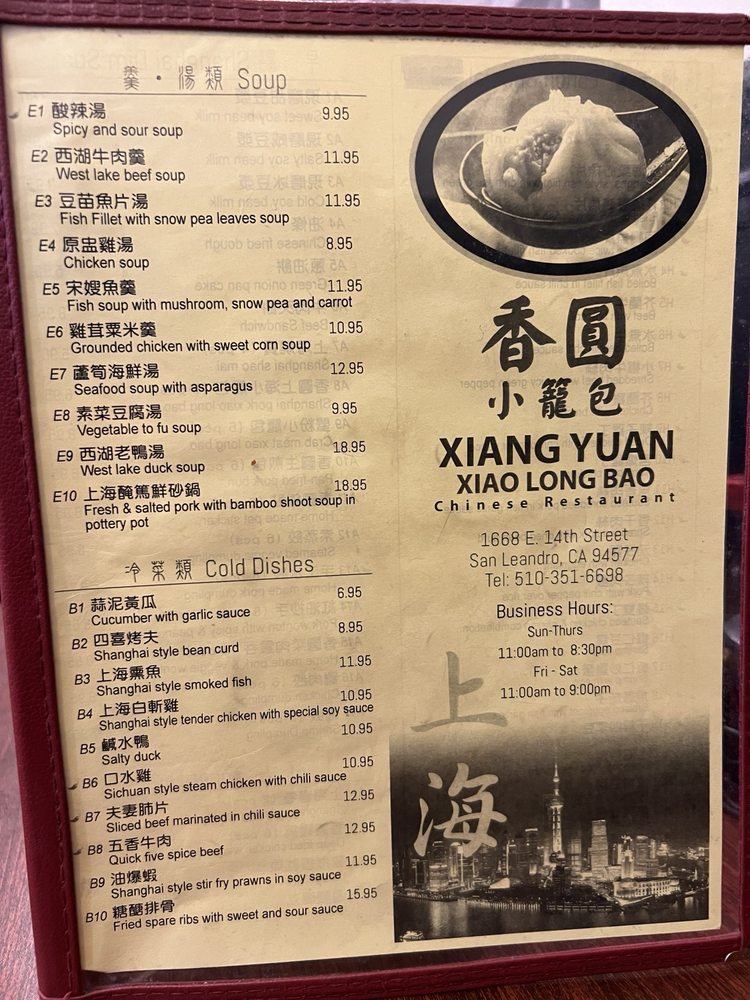 Xiang Yuen Xiao Long Bao is a Shanghai style restaurant located in San Leandro, CA, known for its handmade dumplings and noodles. The menu includes Shanghai Pork XLB, Crab XLB, Steamed Veggie Dumplings, Salted Pork Fried Rice, Spicy Braised Beef Noodles, and more. Customers have praised the authentic, home cooked comfort food and the freshness of the dishes. The Crab XLB and Shanghai Pork XLB are particularly popular, with rich flavors and perfectly cooked fillings. The cozy atmosphere and friendly service add to the dining experience. Whether you're looking for a casual meal or a group outing, Xiang Yuen Xiao Long Bao offers a variety of options to satisfy your cravings for delicious Chinese cuisine.